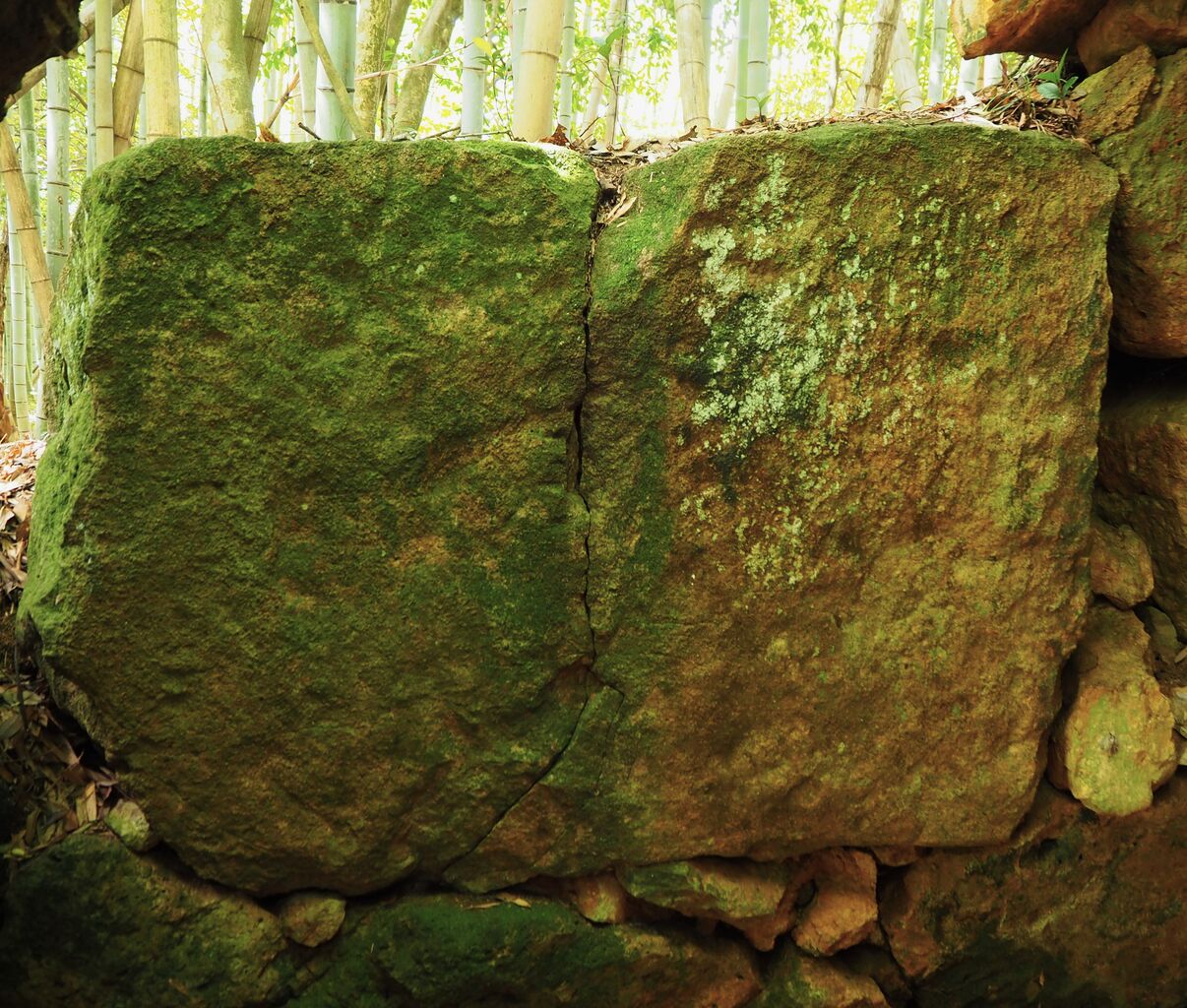 この石室の入口から3m程の所、左側に長さ30cm程の割れ目が入った大きな石がある。
