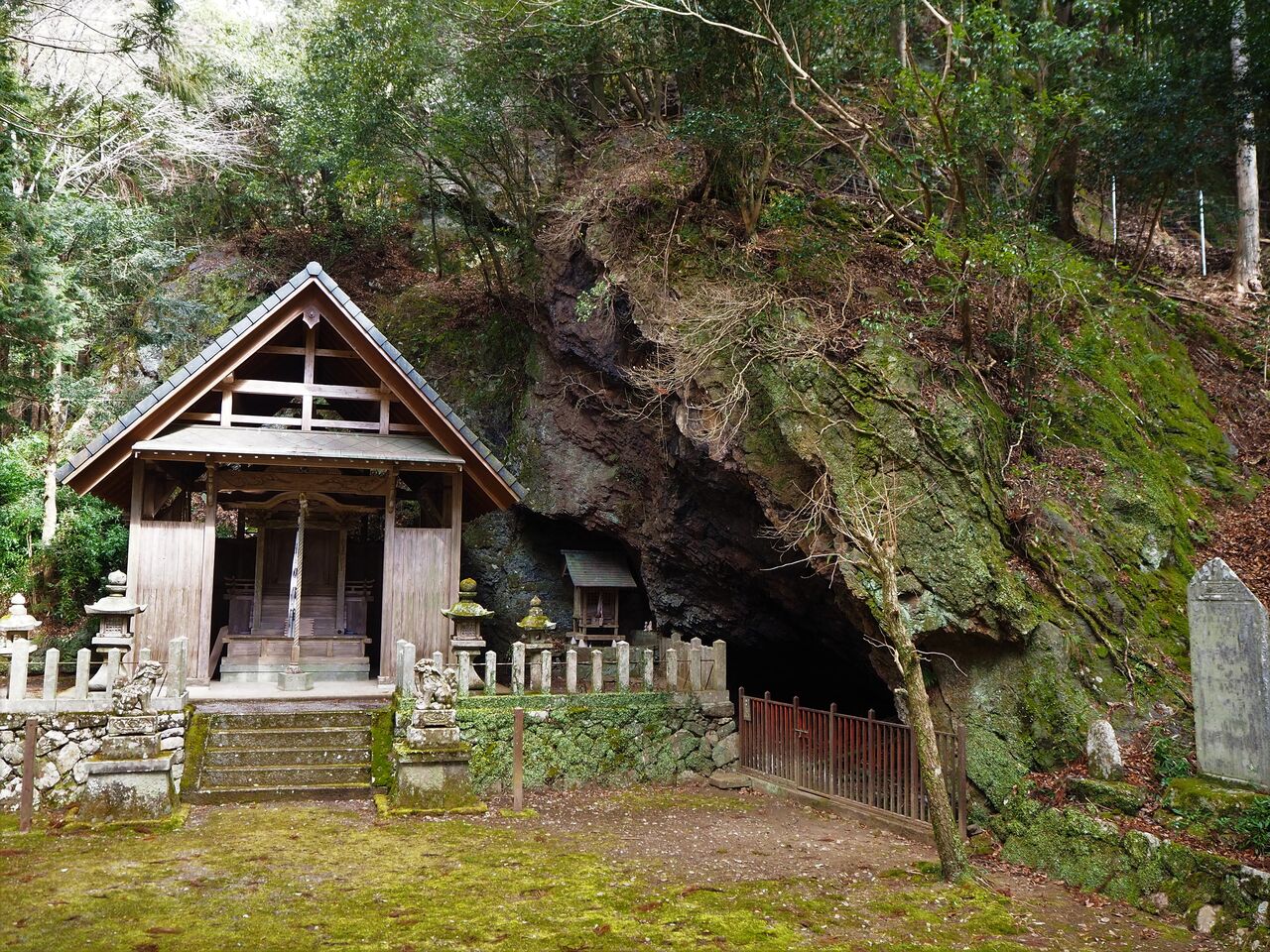 社殿のすぐ右にあるのが土蜘蛛が棲んでいたという洞穴。